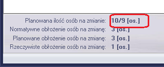"Planowane obłożenie osób na zmianę" - jest to wartość odnosząca się już do czasów rzeczywistych i wyliczana jest na podstawie planowanej ilości osób do wykonania operacji [7] oraz czasu rzeczywistego [11].