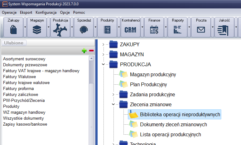 Pracę z operacjami nieproduktywnymi, należy rozpocząć od definicji operacji w bibliotece. Biblioteka znajduje się w sekcji Produkcja->Zlecenia zmianowe-> Biblioteka operacji nieprodukcyjnymi.