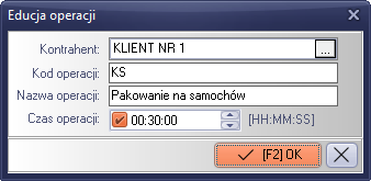 Każda operacja wymaga zdefiniowanie klienta dla którego operacja będzie zdefiniowana. Przypisanie kontrahenta ma znaczenie podczas analizy kosztów związanych w wykonywaniem operacji na zmianie. Po wybraniu klienta, uzupełniamy pola kodu oraz nazwy operacji. Na koniec możemy również zdefiniować domyślny czas wykonania operacji. Zdefiniowany czas będzie przepisywany jako wzorzec podczas dodawania operacji do zlecenia zmianowego. Po wypełnieniu pól zatwierdzamy klawiszem "[F2] OK".