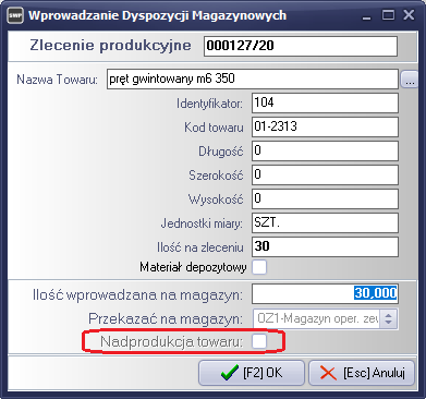 Podczas tworzenia dyspozycji magazynowej, możliwe jest oznaczenie danej dyspozycji jako nadprodukcja. W takim przypadku produkt lub półprodukt zostanie automatycznie przeniesiony na stan magazynowy bezpośrednio już jako produkcja własna.