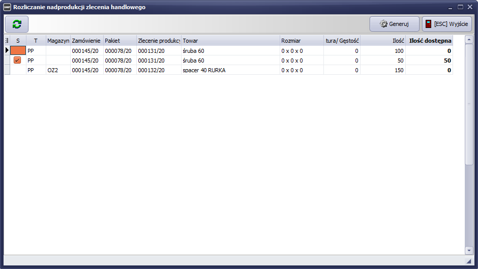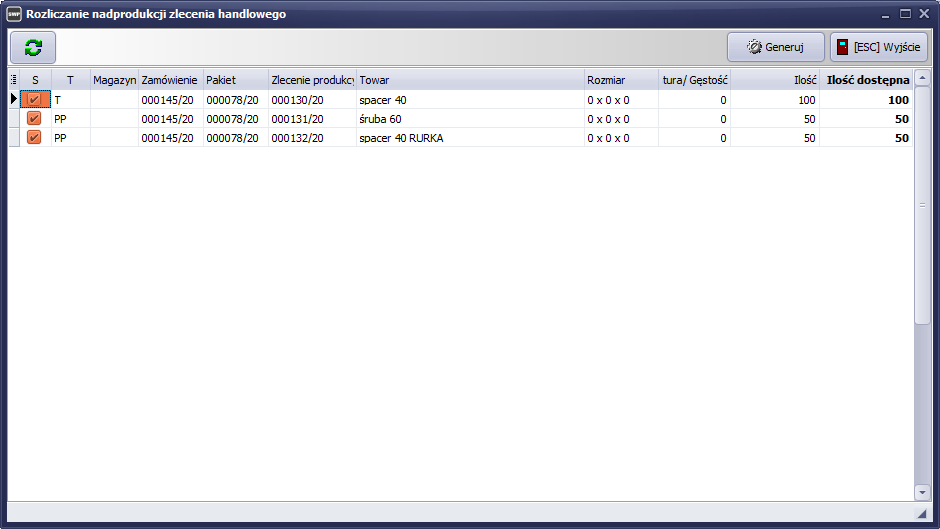 Jeśli pozycja na stanie magazynowym będzie posiadała zdefiniowaną rezerwację, system pokaże ilość pomniejszoną o tą rezerwację w kolumnie "Ilość dostępna". W kolumnie "Ilość", przedstawiona jest cała ilość na stanie magazynowym. Po otwarciu okna wszystkie pozycje będą oznaczone do przekazania jako nadprodukcja (znacznik w kolumnie "S"). Znacznik kolumny "S", można dowolnie ustawić przy pomocy lewego klawisza myszy, lub klawisza "spacja". Kolumna "T", przedstawia opis typu towaru, "T" - produkt, "PP"- półprodukt.