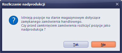 Podczas zamykania zamówienia handlowego system kontroluje, czy na stanie magazynowym pozostały jakieś pozycje dotyczące zamówienia. Jeśli tak, pojawi się komunikat jak poniżej.