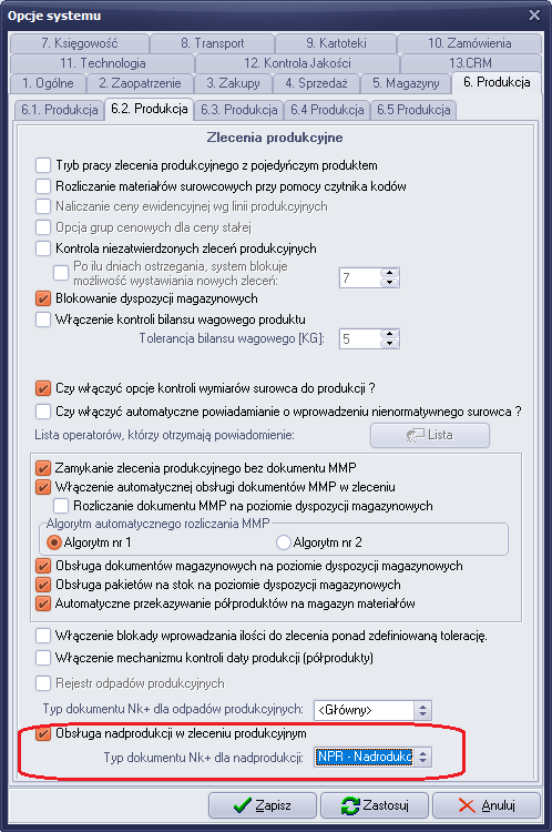 Kolejnym krokiem, będzie ustawienie typu dokumentu dla operacji nadprodukcji oraz aktywowanie mechanizmu. Operację tą wykonujemy w opcjach systemu zakładka Produkcja 6.2.