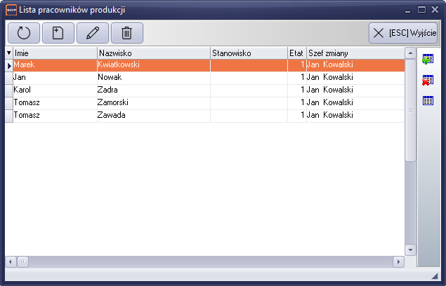 Po utworzeniu grupy szefów zmiany przystępujemy do tworzenia listy pracowników produkcji.