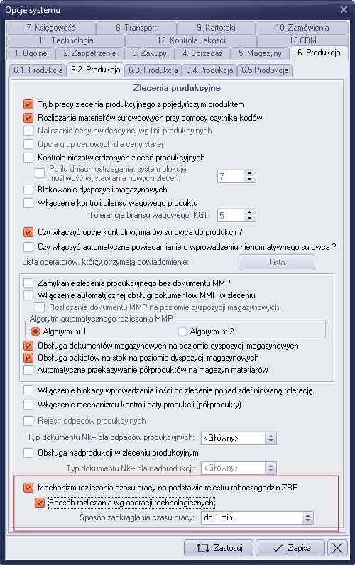 W sekcji „Produkcja>-6.2 Produkcja” ustawiamy znacznik „Mechanizm rozliczania czasu pracy na podstawie rejestru roboczogodzin ZPR ”. W przypadku rozliczania zlecenia na poziomie operacji technologicznej, zaznaczyć również znacznik „sposób rozliczania wg operacji technologicznej”.