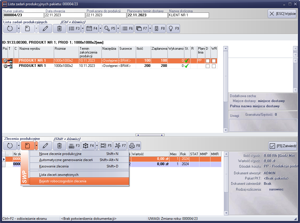 Zapisy do rejestru roboczogodzin, można wprowadzać również z poziomu pozycji pakietu zadań produkcyjnych.