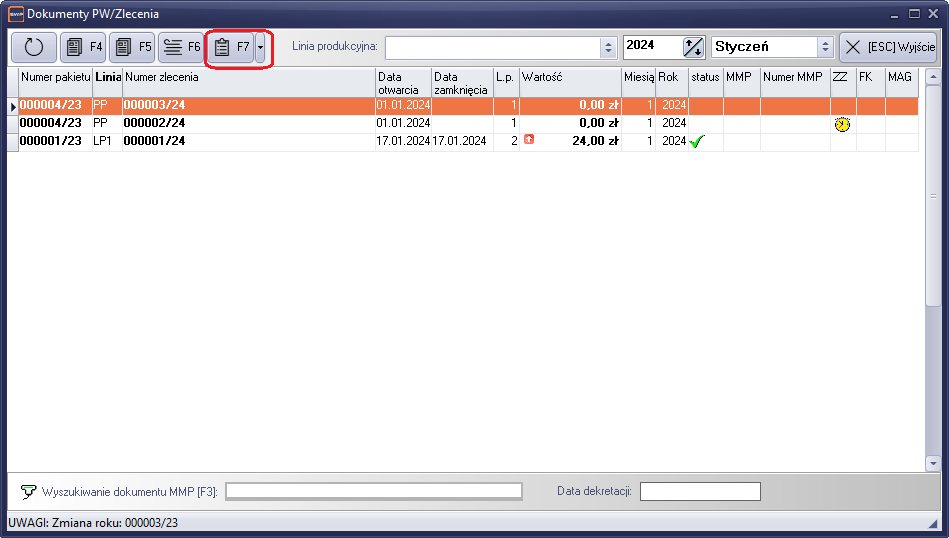 W celu wykonania rejestracji oznaczamy zlecenia dla którego będziemy wykonywać wpis i uruchamiamy rejestr klawiszem „F7”.