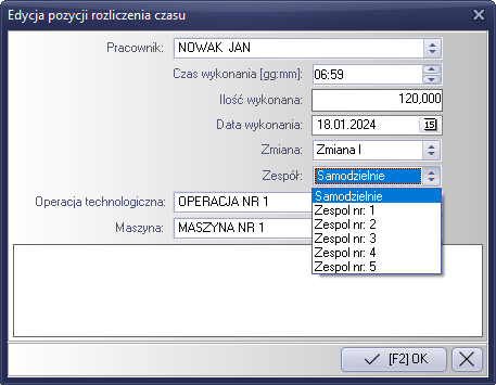 Rysunek 794 Uzupełnienie pól czasu pracy, ilości wykonanych, daty wykonania operacji i ilości osób.