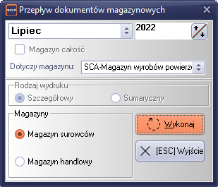 Zestawienie przedstawia przepływ dokumentów w zadanym miesiącu obrotowym, gdzie przepływ może dotyczyć magazynu surowców lub magazynu handlowego jak również każdego zdefiniowanego pod-magazynu. Zestawienie ułożone jest chronologicznie wg czasu wystąpienia zdarzenia.