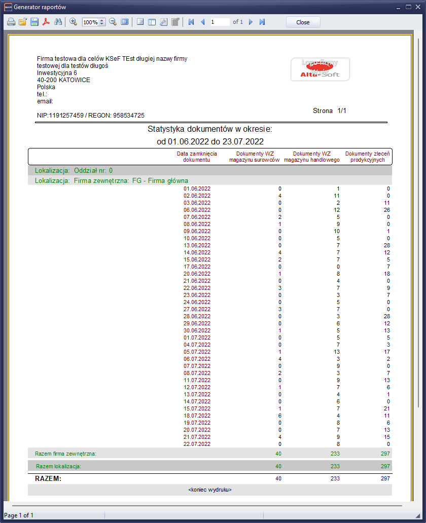 Raport przedstawia statystyki dokumentów rozchodowych WZ oraz dokumentów przychodowych PW (Zleceń produkcyjnych), w rozbiciu na dni w zadanym okresie czasu.