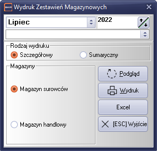 Po uruchomieniu funkcji, pojawia się okno ustawień wydruku. Należy wybrać interesujący nas miesiąc obrotowy oraz magazyn, z którego chcemy uzyskać informacje.