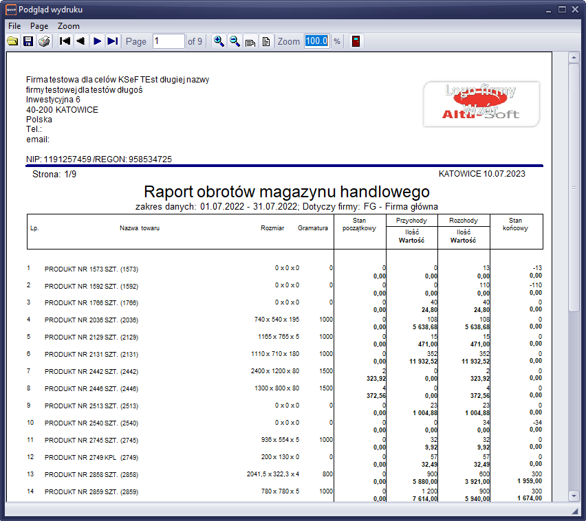 Zestawienia przedstawiające poszczególne towary oraz operacje magazynowe. Wydruk przedstawia aktualny stan magazynowy towaru oraz wartości operacji w danym miesiącu obrotowym.