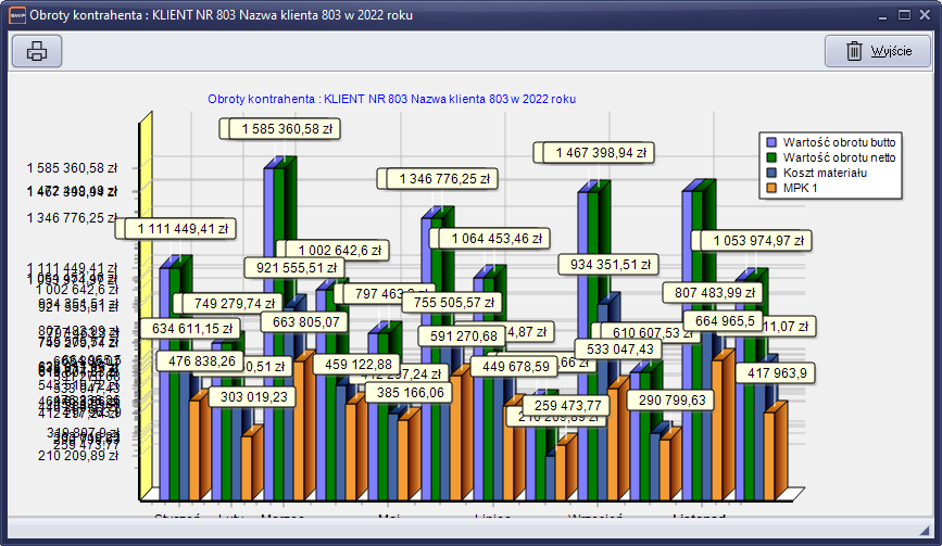 Zestawienie pokazujące obroty z wybranym kontrahentem. Zestawienie zawiera, zarówno informacje o zakupach jak i sprzedaży, jeśli kontrahent jest jednocześnie dostawcą i odbiorcą. Aby wyświetlić informacje, należy wybrać interesujący nas rok obrotowy i wybrać odpowiedniego kontrahenta, przy pomocy klawisz po prawej stronie pola „Nazwa skrócona”.