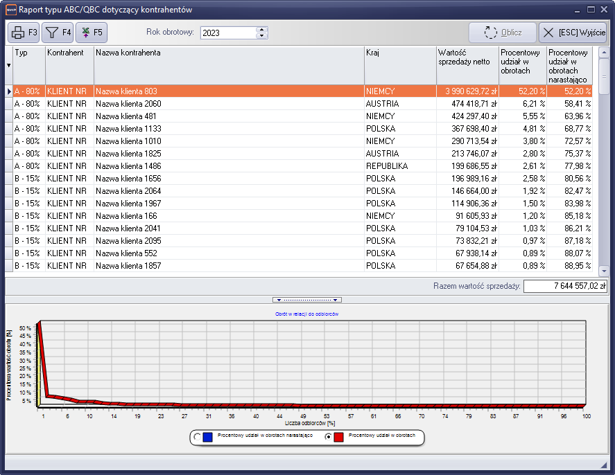 Klasyczny raport ABC obrotów kontrahentów. Raport pokazuje jacy kontrahenci składają się odpowiednio na 80%,15%,5% całkowitego obrotu firmy.