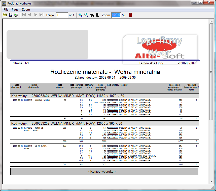 Raport przedstawia rozliczenie materiału w przypadku produkcji z materiałów powierzonych. Raport bilansuje przychody danego materiału, stan magazynowy i rozchody do produkcji z towarem wyprodukowanym.