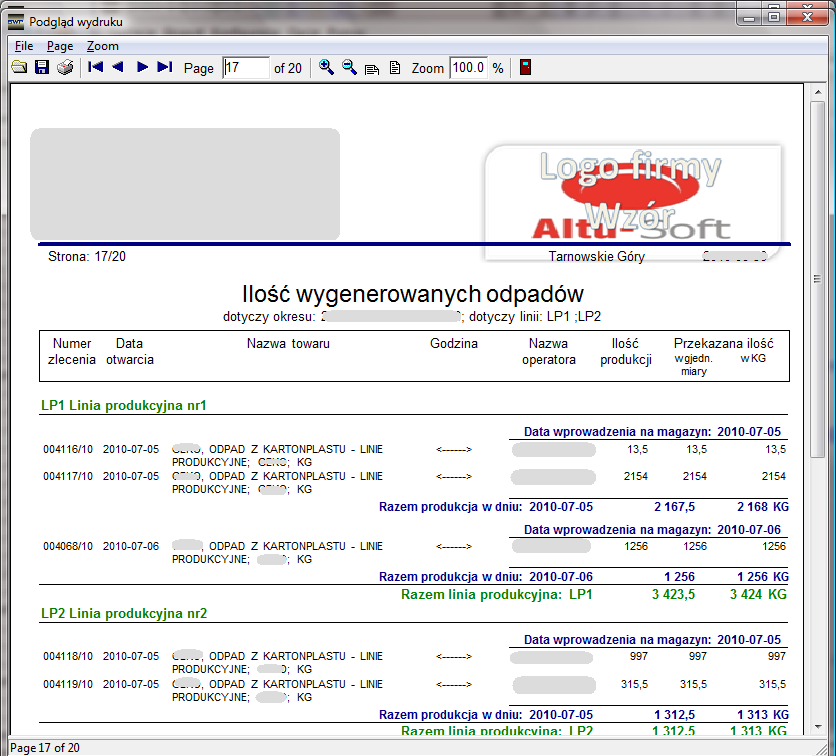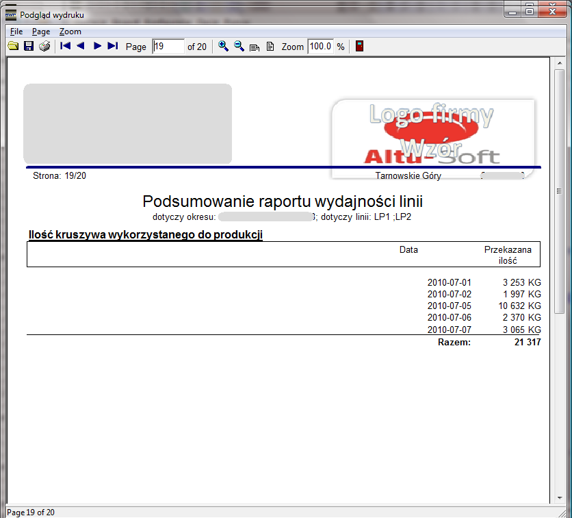 - "Raport wydajności linii produkcyjnych". Raport przedstawia w podziale na linie i dni, przekazaną na magazyn ilość produktów gotowych. W rejestrze widoczny jest data, czas przekazania oraz osoba odpowiedzialna.
