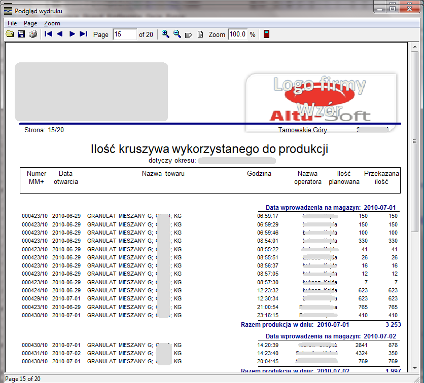 - "Ilość kruszywa wykorzystanego do produkcji". Raport przedstawia wykorzystaną ilość kruszywa w produkcji. Informacja zawiera datę czas i osobę pobierającą kruszywo do produkcji.