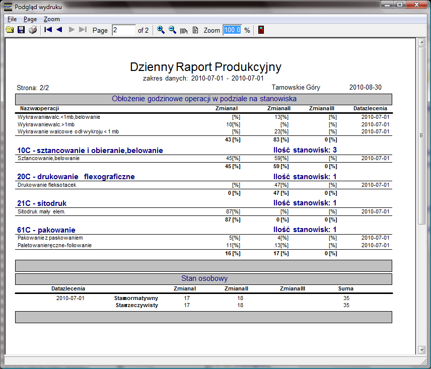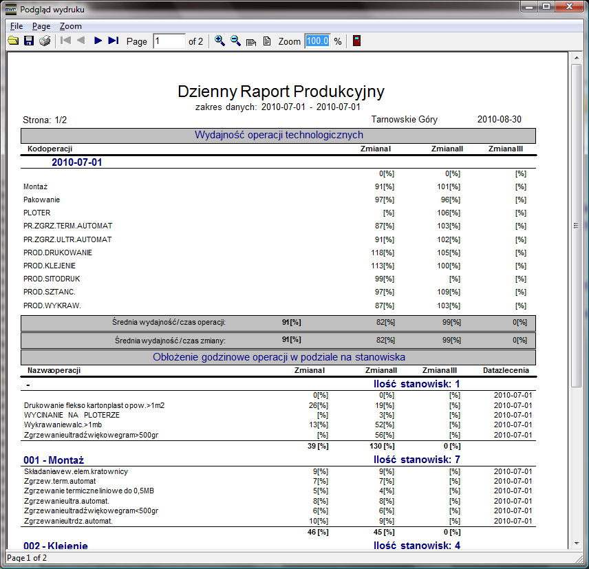 Raport składa się z trzech części. Pierwsza to "Wydajność operacji technologicznych", przedstawia operacje wykonane w zadanym okresie czasu oraz wydajność na tych operacjach wyrażona procentowo w podziale na zmiany. Operacje wyliczone są na podstawie zleceń zmianowych. Druga część raportu to "Obłożenie godzinowe operacji w podziale na stanowiska". Trzecia część raportu to "Stan osobowy".