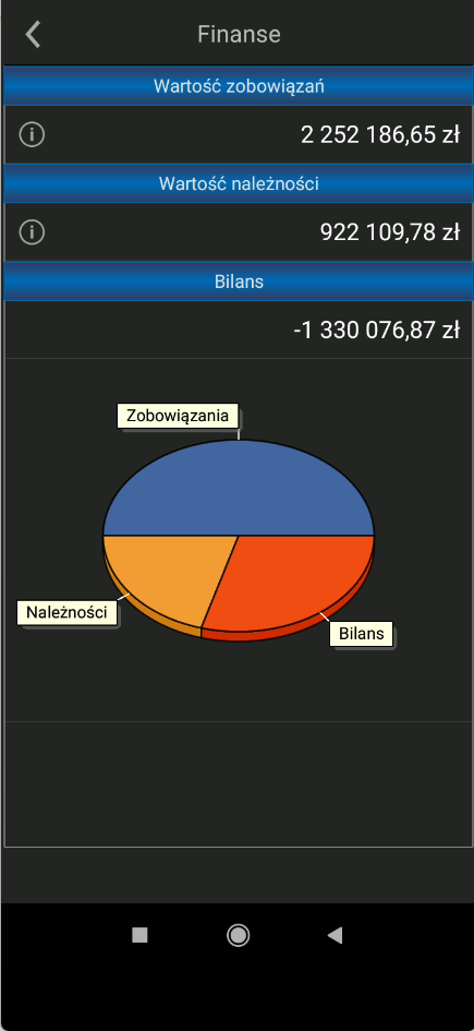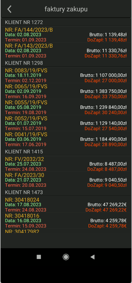 Poprzez stuknięcie na wartość zobowiązań lub należności, otwieramy odpowiednio listę faktur zakupu lub sprzedaży. Lista zawiera informacje o terminach zapłaty i wielkości zapłaty do realizacji.