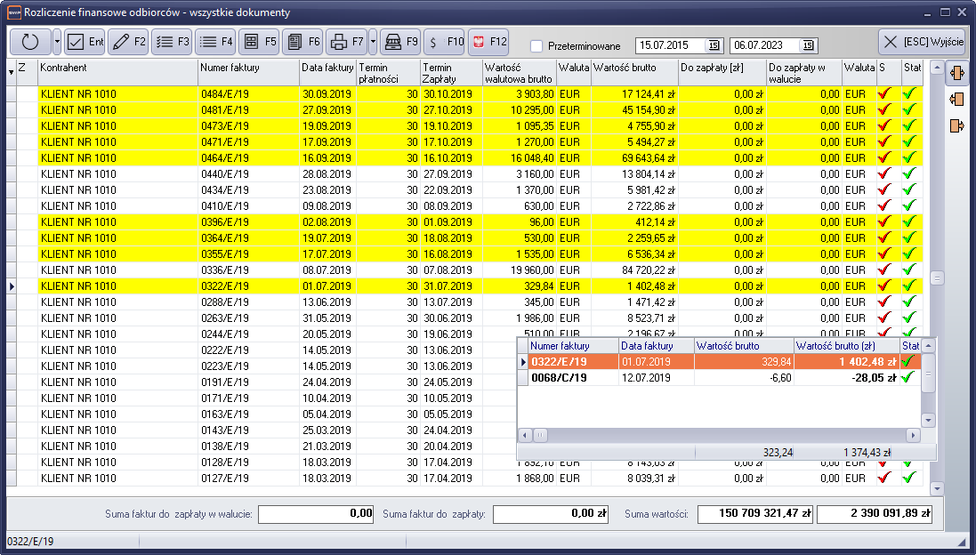 Jeśli jakaś faktura posiada korektę, w liście zostaje oznaczona kolorem żółtym. w takim przypadku wartość do zapłaty zostaje skorygowana o wartość korekty. Jeśli chcemy zobaczyć oryginalne wartości, należy zaznaczyć daną fakturę i nacisnąć klawisz „F2”. Na ekranie pojawi się dodatkowe okienko z korektami.