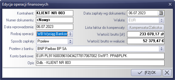 - rodzaju operacji – wybieramy odpowiedni rodzaj operacji (KP- Kasa przyjmie, WB- Wyciąg bankowy)