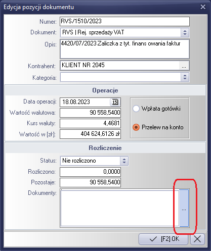 W następnym kroku potwierdzamy wybrane faktury klawiszem "OK". W formularzu edycji w polu "Dokumenty", zostanie zaktualizowana informacja o dokonanym rozliczeniu.