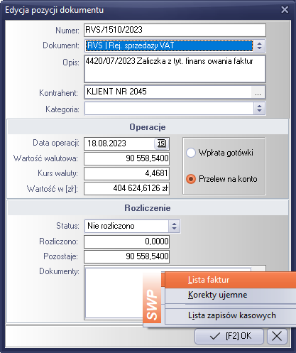 Po uzupełnieniu pól w formularzu (Kontrahent, Data operacji, wartość walutowa), zatwierdzamy tworzony zapis. Uwaga data operacji musi być zgodna z otwartym rejestrem kasowym.