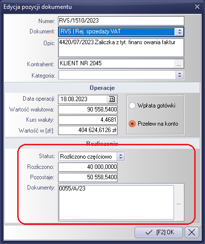 Kolejnym krokiem będzie zatwierdzenie zmian klawiszem "OK" formularza edycji zapisu rejestru kasowego. Po dokonaniu potwierdzenia, automatycznie zostanie wprowadzona wartość zapłaty do faktur rozliczanych. Zostanie również zmieniony odpowiednio status zapisu. W tym przypadku na "Rozliczony częściowo".