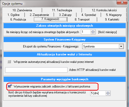 1. Wymuszanie wiązania zaliczek z odbiorców z fakturami proforma. Ustawienie opcji umożliwi przypisywanie faktur proforma podczas tworzenia pozycji zaliczkowej w dokumencie wyciągu bankowego oraz raportu kasowego.