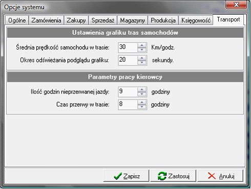 Oprócz uprawnień, powinniśmy zdefiniować parametry pracy modułu. Parametry definiujemy w module Opcji programu „Opcje> Opcje programu-> Transport”. Tutaj znajdują się następujące parametry.