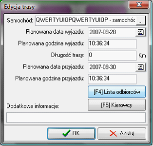 W formularzy wybieramy z listy odpowiedni samochód dla którego tworzymy trasę. Określamy datę i czas wyjazdu. Opcjonalnie można określić długość trasy w kilometrach. Podczas wyjścia z pola edycyjnego długości trasy, system zapyta czy obliczyć termin przyjazdu. Termin przyjazdu obliczany jest na podstawie parametrów: