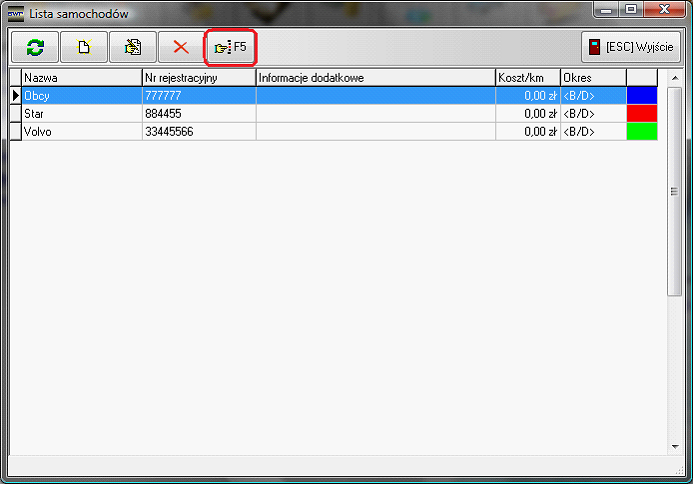 Listę wskaźników dodajemy z poziomu listy samochodów. Lista dostępna jest pod klawiszem „F5”