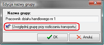 Rysunek 969 Opcja powodująca uwzględnienie grupy podczas generowania raportu rozliczenia tras