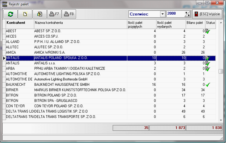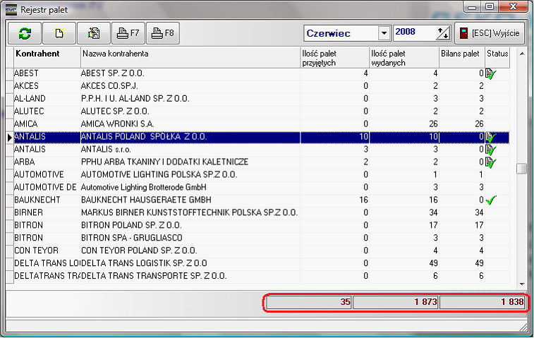 Kolumna „Status”, zawiera informacje o sytuacji rozliczeniowej danego klienta. Jeśli kolumna nie zawiera żadnego znaku graficznego, oznacza to, że ilość palet danego klienta w danym miesiącu nie została zbilansowane. Jeśli w kolumnie pojawi się znaczek „