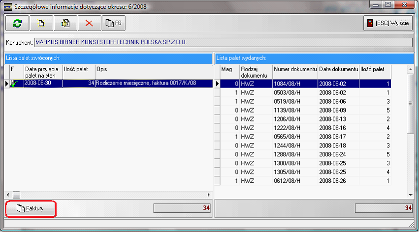 Fakturę rozliczeniową wystawia się z poziomu rejestru palet, w oknie informacji szczegółowych kontrahenta. Do tego celu służy klawisz „F6”.