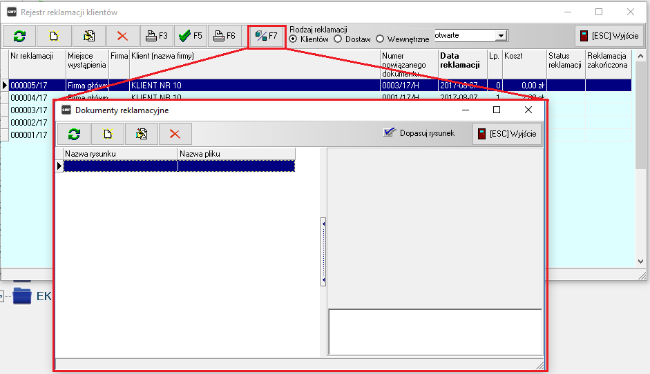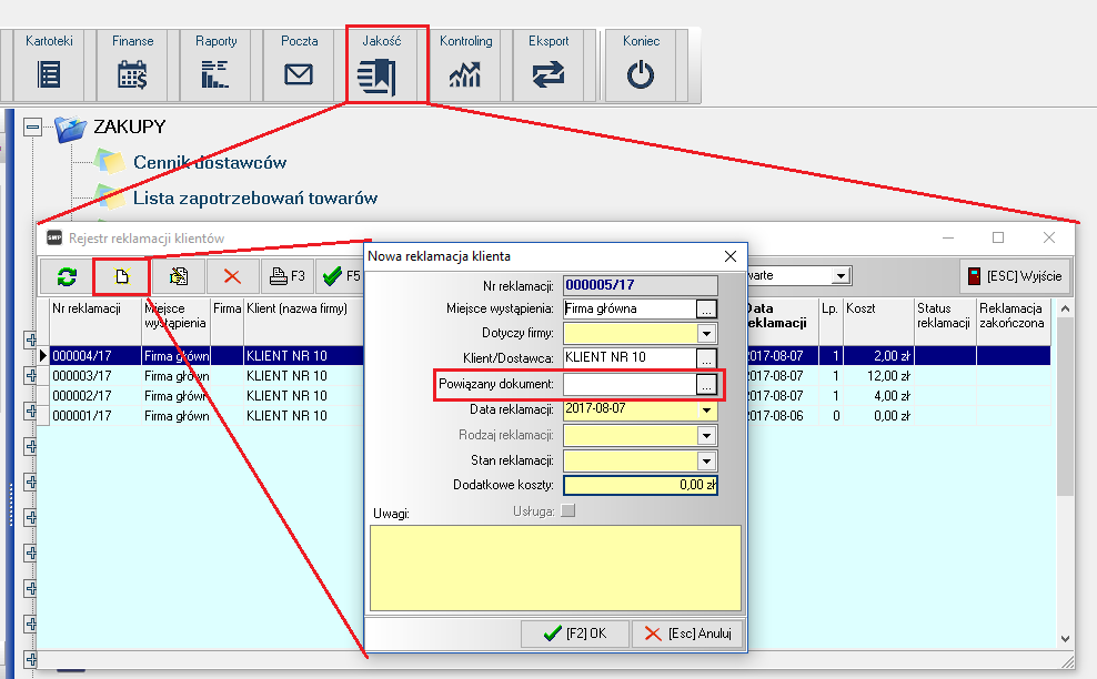 Dodawanie dokumentu przeprowadzamy z poziomu okna nagłówków reklamacji.