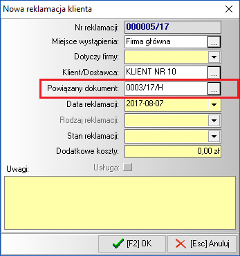 Podczas dodawania nowej reklamacji klienta, możemy reklamację powiązać z dokumentem rozchodowym WZ. Dzięki takiemu powiązaniu uzyskujemy powiązanie z dokumentem zlecenia produkcyjnego, co daje nam informację o numerze zlecenia, dacie produkcji oraz linii produkcyjnej. W celu powiązania dokumentu WZ , w oknie formularza reklamacji, należy uzupełnić pole "Powiązany dokument ".