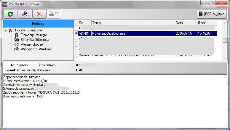 - "Włączenie kontroli przychodów towaru na magazyn". Podczas zatwierdzania dokumentu przychodu, system wyśle wiadomość pocztą wewnętrzną do właściciela zapotrzebowania (właściciela zamówienia handlowego w rejestrze handlowym, na podstawie którego powstało zapotrzebowanie) o wprowadzeniu towaru na stan magazynu.