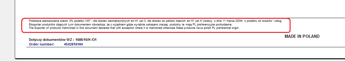 Dodatkowe informacje pojawiające się w stopce faktury walutowej. Informacje zdefiniowane w języku polskim, angielskim i rosyjskim. Informacja polska pojawia się zawsze na fakturze. Informacje w językach angielskim lub rosyjskim pojawiają się zależnie od konfiguracji języka w kartotece klienta.