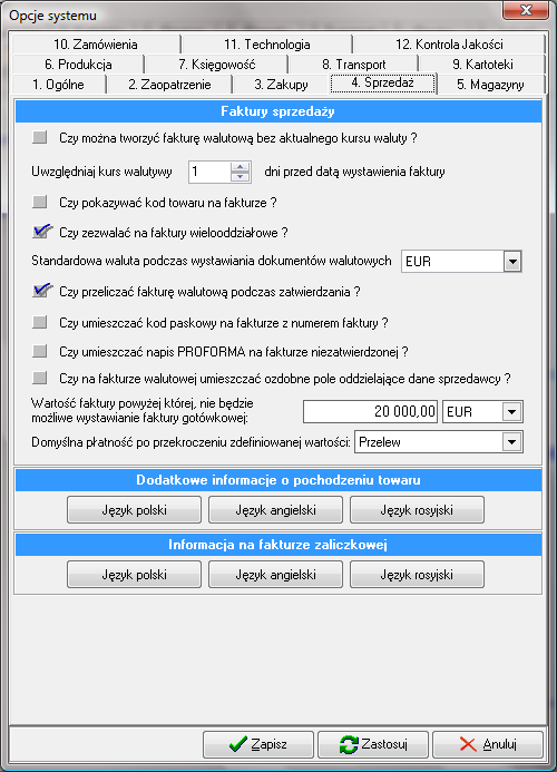 Dodatkowe informacje pojawiające się w stopce faktury zaliczkowej. Informacje zdefiniowane w języku polskim, angielskim i rosyjskim. Informacja polska pojawia się zawsze na fakturze. Informacje w językach angielskim lub rosyjskim pojawiają się zależnie od konfiguracji języka w kartotece klienta.