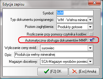 - "Włączenie automatycznej obsługi dokumentów MMP w zleceniu". Włączenie opcji spowoduje automatyczne generowanie dokumentów MMP dla zleceń produkcyjnych. Zlecenia produkcyjne muszą należeć do ośrodka kosztów ze zdefiniowanym wskaźnikiem automatycznego generowania dokumentów MMP.
