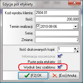 - "Wydruk etykiety bez szablonu ". Zaznaczenie opcji powoduje wydruk jedynie zawartości etykiety, bez tabelek. Wydruk przeznaczony jako nadruk na gotowy formularz etykiety.