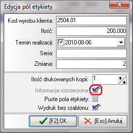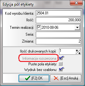 - "Drukowanie informacji rozszerzonej w etykiecie produktu". Zaznaczenie opcji wymusza drukowanie informacji rozszerzonych o dostawcy i miejscu dostawy na etykiecie produktu gotowego. Wymuszenie polega na zaznaczeniu opcji "Informacja rozszerzona" na formularzu etykiety produktu.