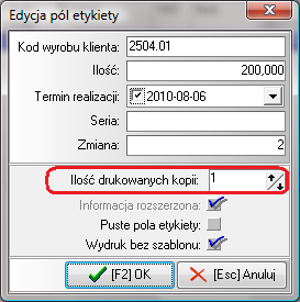 - "Ilość kopii drukowanych etykiet:". Określa ilość kopii w formularzy edycji etykiety produktu.