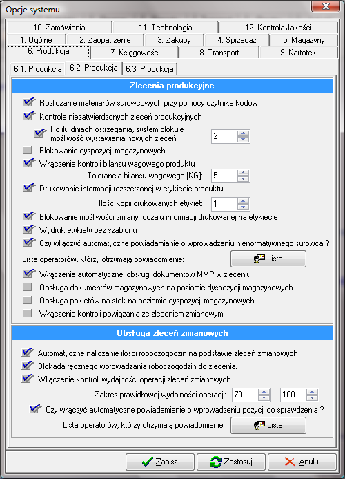 - "Włączenie kontroli wydajności operacji zleceń zmianowych". Włączenie opcji spowoduje, że system będzie kontrolował wykonanie ostatniej tego typu operacji. Jeśli wykonana ostatnio operacja nie będzie mieściła się w zakresie zdefiniowanych parametrów, system zaznaczy pozycję zlecenia odpowiednim znakiem graficznym i wyśle informacje do zdefiniowanej grupy. Informacja będzie zawierała treść "TECHNOLOGIA DO WERYFIKACJI".