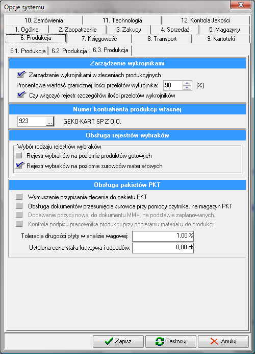 - "Zarządzanie wykrojnikami w zleceniach produkcyjnych". Załączenie opcji powoduje podczas zamykania zlecenia kontrolę, czy wszystkie pozycje towarowe mają przypisane wykrojniki, oraz aktywowanie zostaje naliczanie ilość przelotów dla poszczególnych wykrojników.