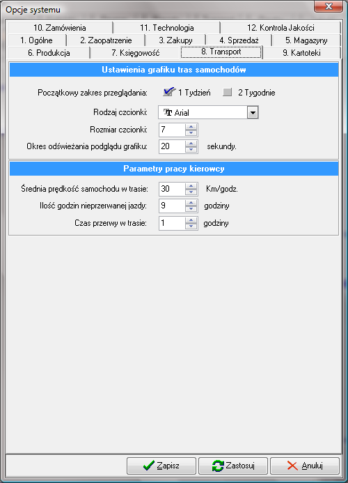 - "Początkowy zakres przeglądania:". Określa jaki zakres będzie pokazywany podczas otwarcia grafiku transportu.