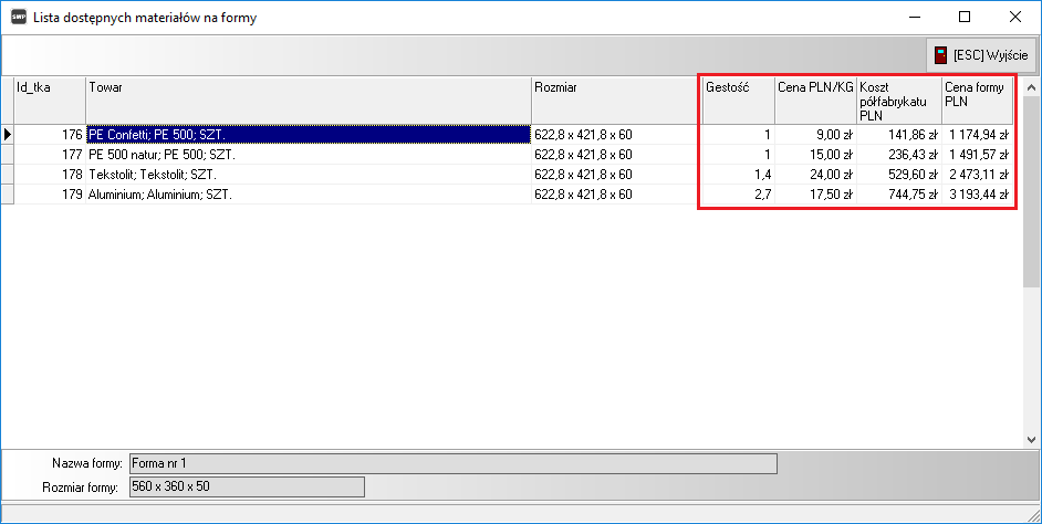 Po naciśnięciu klawisza "Nowy", pojawi nam się lista uprzednio zdefiniowanych i przypisanych do listy materiałów przeznaczonych do produkcji formy. Lista zawiera kompletne wyliczenia rozmiaru, ceny jednostkowej oraz ceny formy.