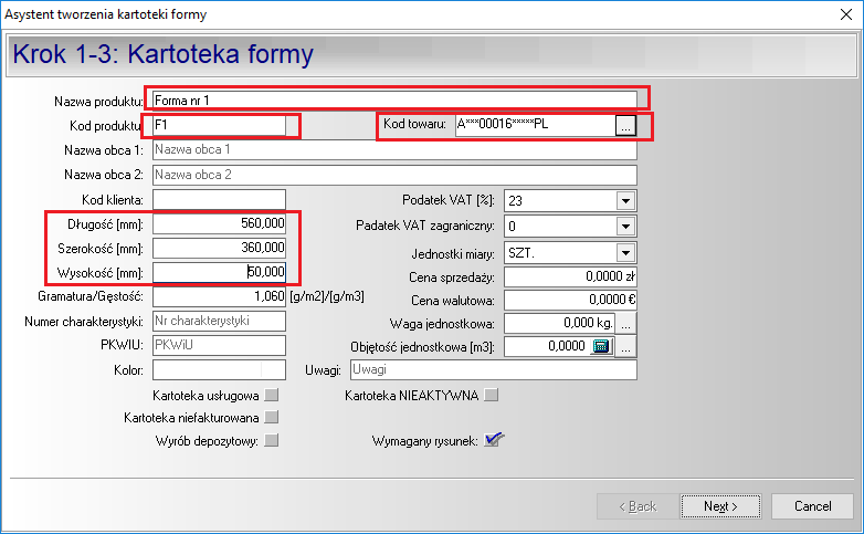 1. W pierwszym kroku definiujemy kartotekę formy. Danymi koniecznymi do wprowadzenia to "Nazwa towaru", "Kod produktu", "Kod towaru" oraz rozmiar formy. Po wprowadzeniu powyższych parametrów przechodzimy do kroku drugiego.
