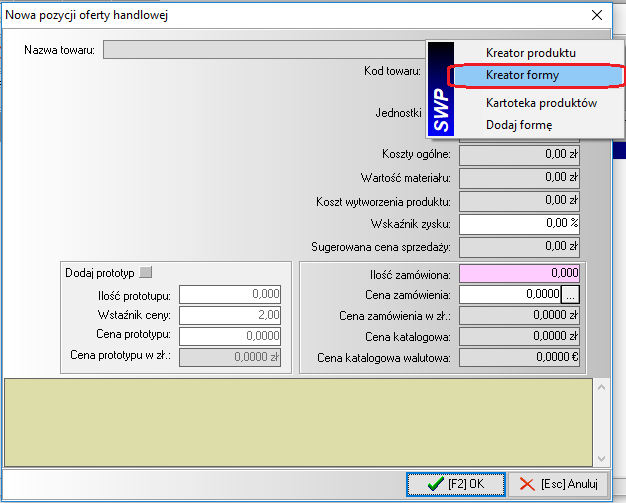 Z poziomu okna pozycji oferty, wybieramy klawiszem "Nowy", formularz edycji. Po otwarciu formularza w polu "Nazwa towaru", wybieramy z menu opcję "Kreator formy".